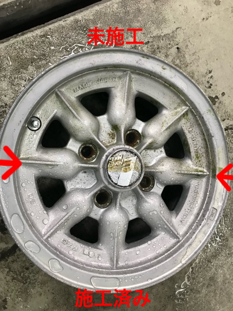 使用していないホイールに半分コーティング剤を吹き付け、もう半分は未施工