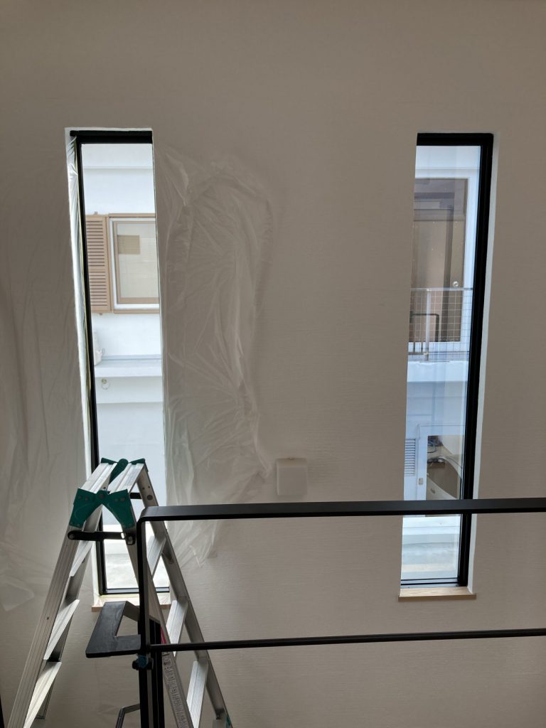 階段側では吹き抜けになっており縦長の窓ガラスにもフィルム貼付け