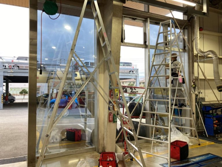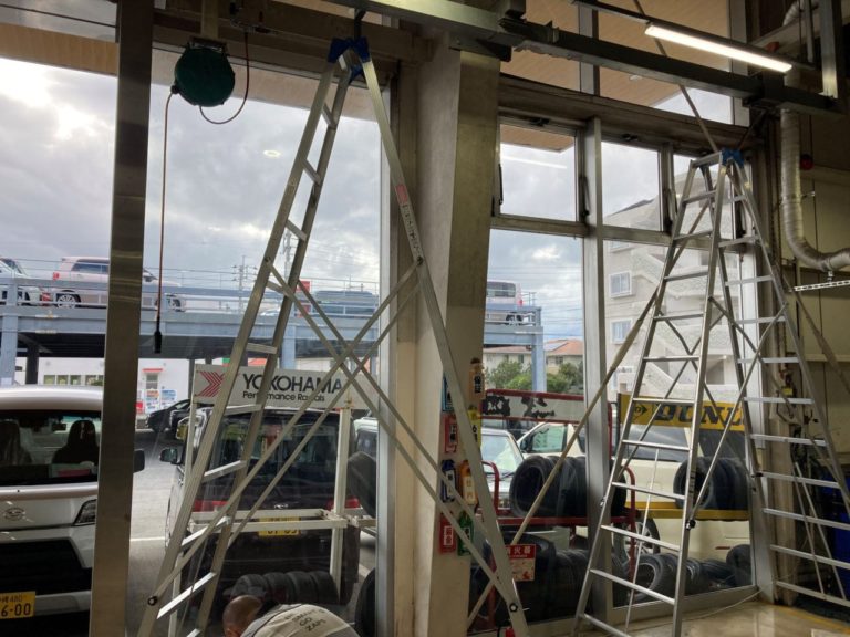 3M近くの高さもありロング脚立を使用して貼り付けです。