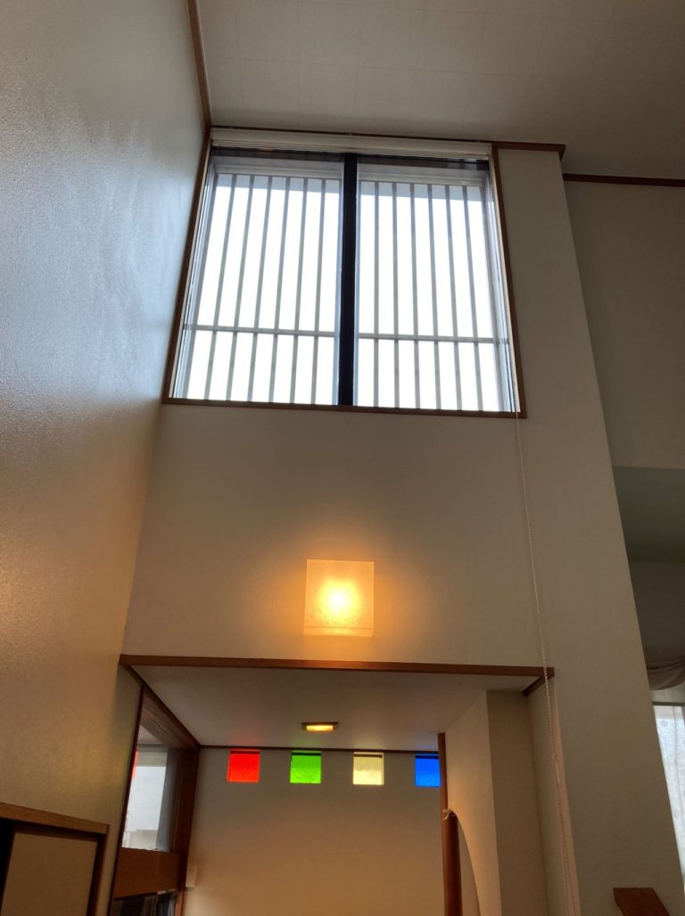 吹抜けガラスにて、午後から西日が常に照らされロールカーテンを下ろしている状態