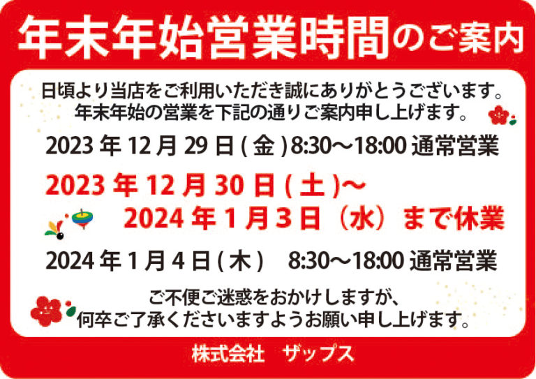 株式会社ザップスは明日の12月29日18時まで通常営業してます(^^♪