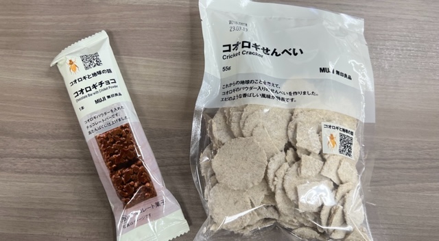 こちらが無印良品さんで見つけた、コオロギパウダーを使用したせんべいと、チョコバーです(*´ω`*)