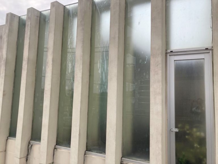 通常のガラスは透明でありますが、 網入りガラスとはガラスの中に鉄製のワイヤー(縦やクロスような形状)が、入っているガラスの事を言います。 これは建築基準法第64条に定められた開口部の防火戸に規定される延焼の恐れのある開口部(窓やドア)にその使用が義務付けられた防火ガラスなのです。