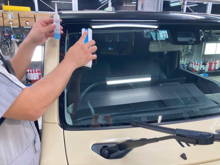 撥水用の液剤のノリをよくするために丁寧に磨いていきます。