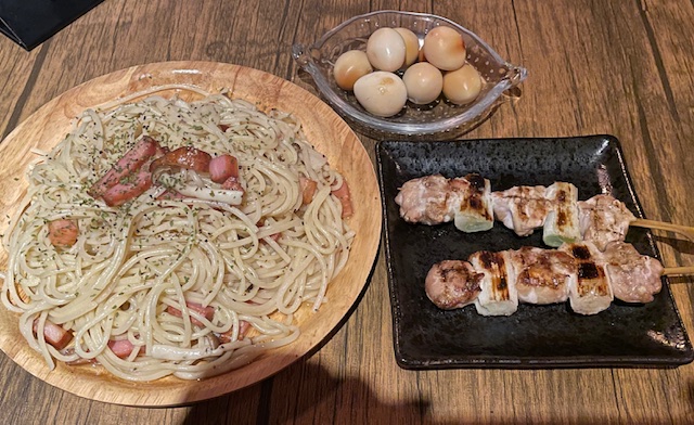 きのことベーコンのペペロンチーノ~燻製オイル仕立て~に、焼き鳥各種、燻製ホタテなど