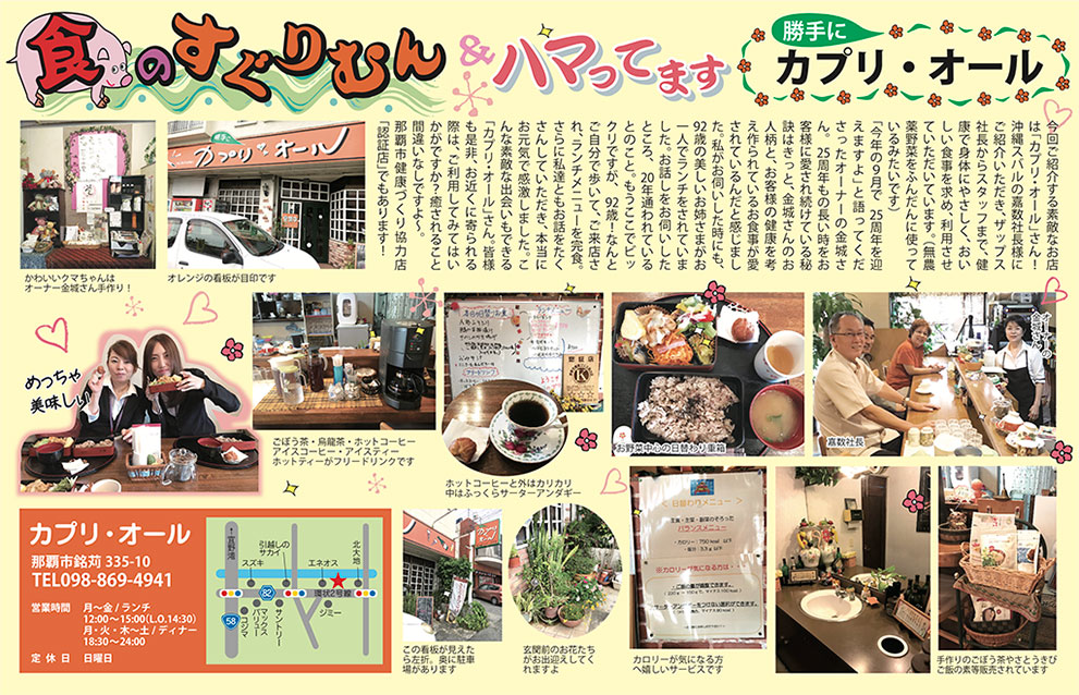 今回ご紹介する素敵なお店は「カプリ・オール」さん!沖縄スバルの嘉数社長様にご紹介いただき、ザップス社長からスタッフまで、無農薬野菜をふんだんに使った健康で身体にやさしく、おいしい食事を求め利用させていただいています。