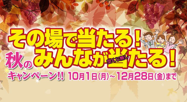 秋のキャンペーンが始まりました! その場で当たる!空くじなしでみんなが当たる!!今回も選りすぐりの賞品をご用意しています。 この…