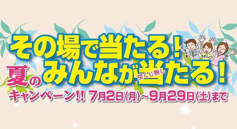 夏のキャンペーンが始まりました! その場で当たる!空くじなしでみんなが当たる!!今回も選りすぐりの賞品をご用意しています。 この…
