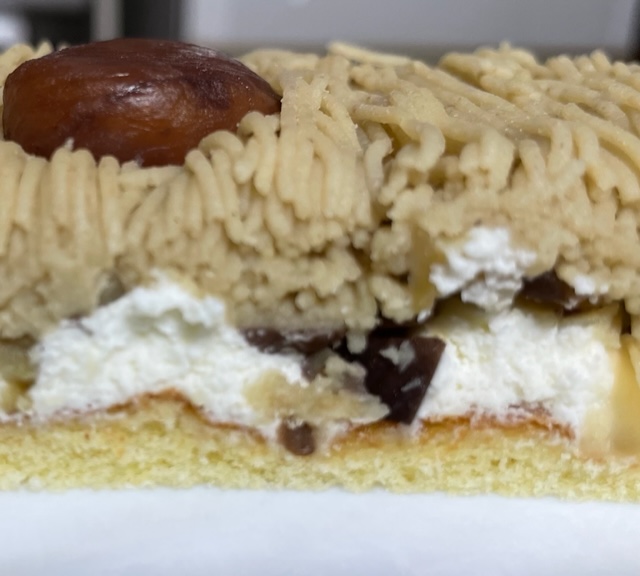 スポンジケーキ、栗のスライス、北海道産濃厚生クリーム、アーモンドキャラメリゼが層になっていて