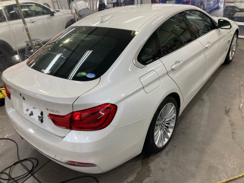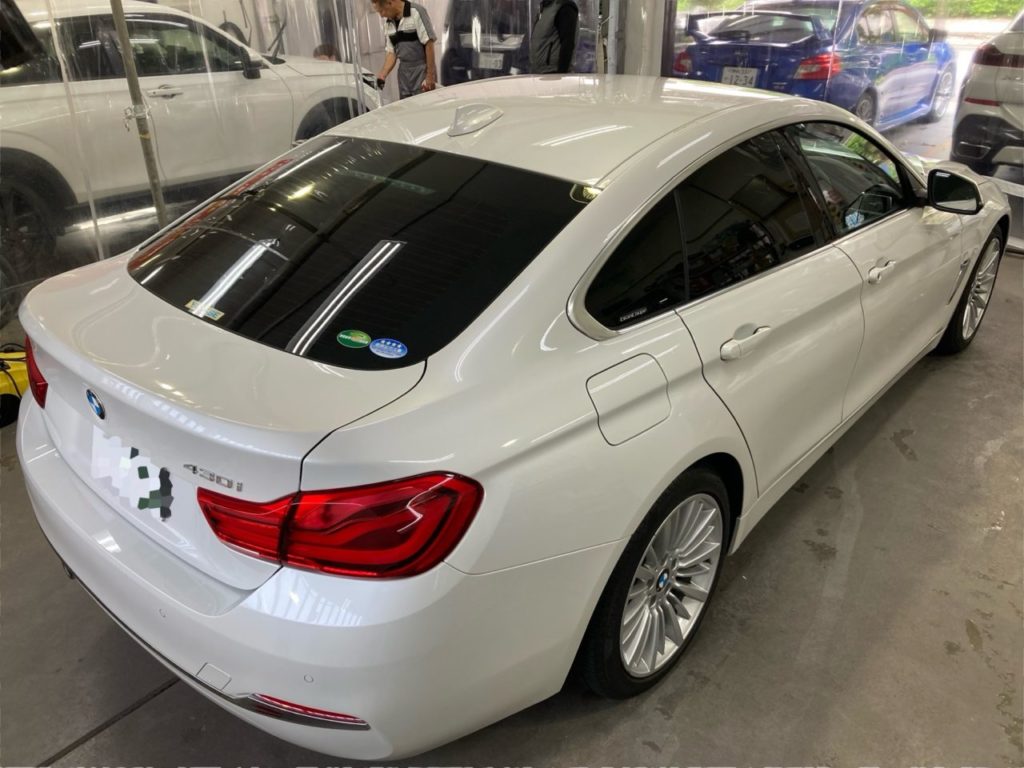 本日フィルム施工でご入庫のお車はBMW 430iです。リアガラスがすべて透明という事で断熱とプライバシー保護の為のご依頼となります。